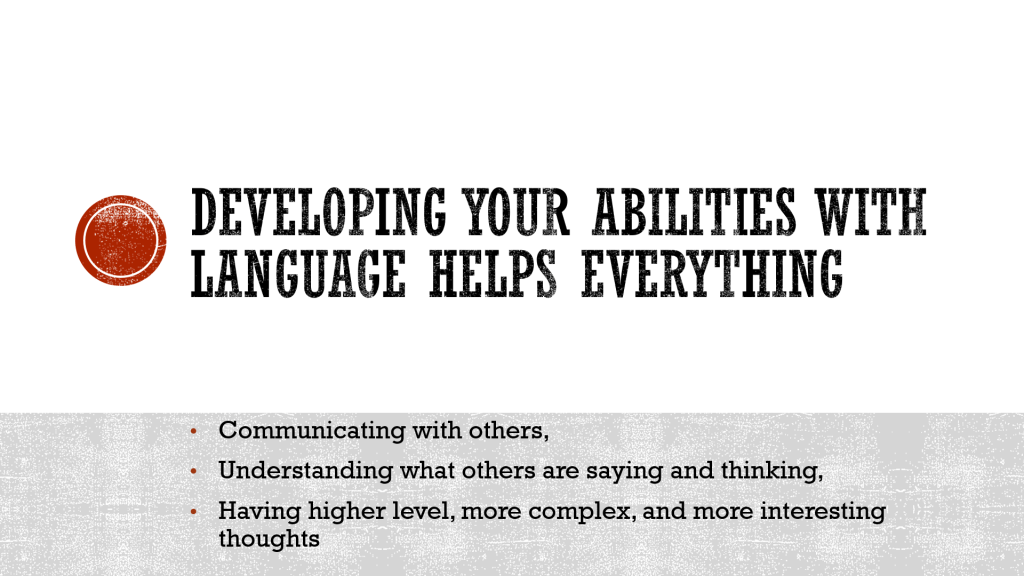 language: the principal method of human communication, consisting of words used in a structured and conventional way and conveyed by speech, writing, or gesture.