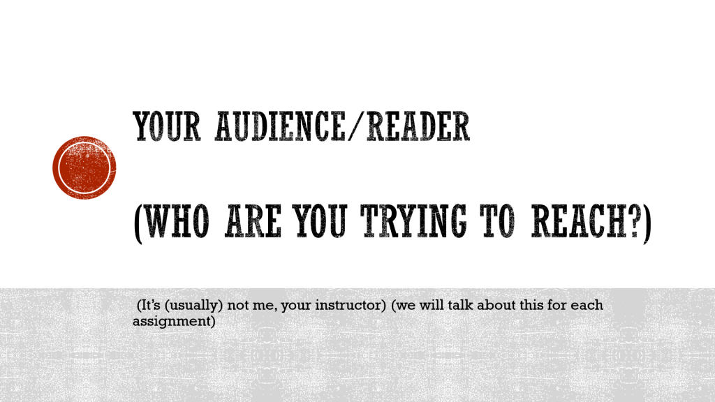 Okay, so this will cover the first 6 weeks of composition class (this is for a 15-week semester and a class that meets twice a week) (and this is the only composition class these studnets are required to take). First, I’ll provide the weekly calendar then below that details on the assignments and exercises (in the order they will be completed). For my grading, exercises are worth 10 points each and assignments (papers) are worth 100 points each.