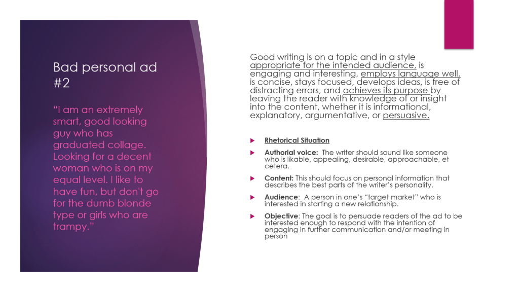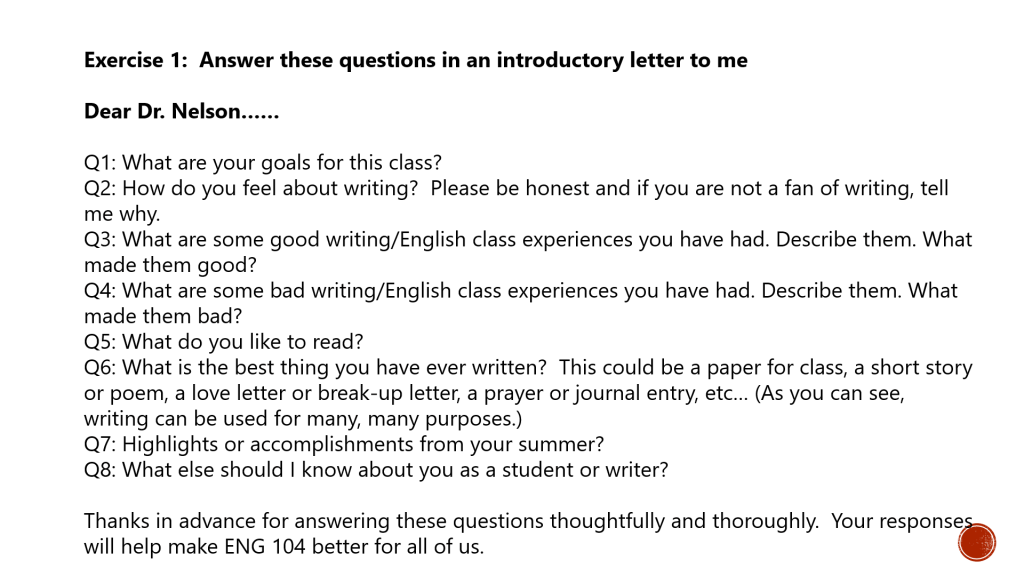 Exercise 1: After I show students an introductory PowerPoint outlining why learning to write is important, stating my goals for the class (what I hope they will learn), and introducing them to the “Rhetorical Situation” I want them to consider for everything they write, I ask them to write me an Introductory Letter, answering these questions: