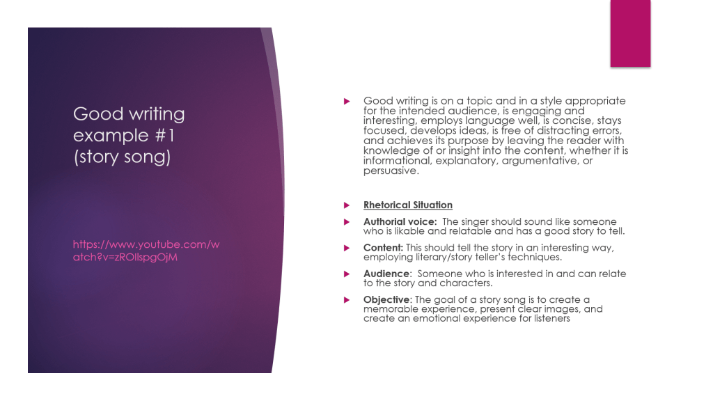 This is a good way to get students working in groups, with a specific task. You can complete this in a 50-minute class. Along the way, you will learn more about what they value, or what they’ve been taught to value, in writing (and what you have to teach and maybe unteach them). You get to model the thinking/writing/revision process that you want students to engage in all semester. This also helps (as other early-semester assignments do) that this is “their” class, not just yours. Specifically, this exercise lets them feel like they have come up with a definition of good writing (they are, but with your help) and later in the semester, you and they can both refer back to this for every assignment to help determine if they are producing and submitting “good writing.”